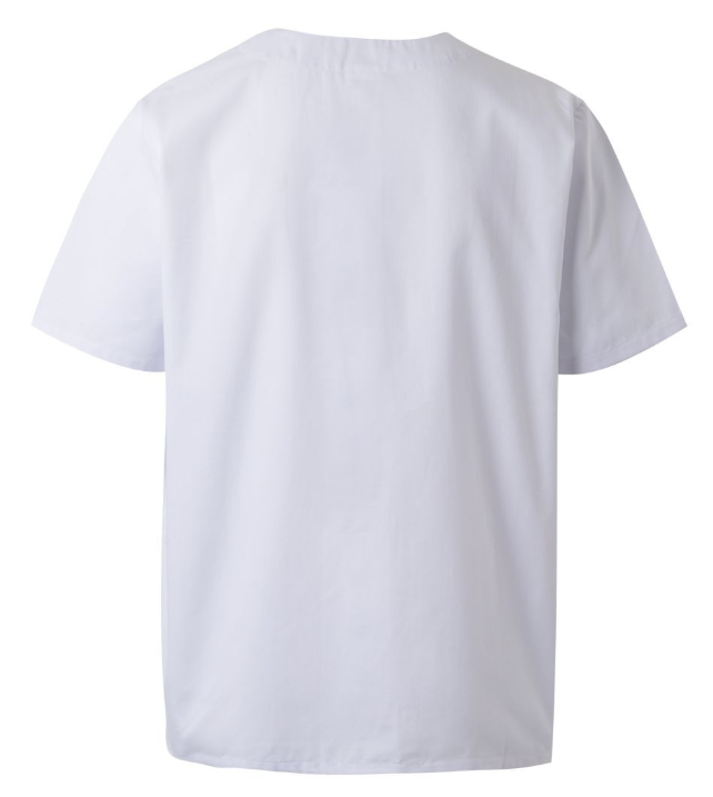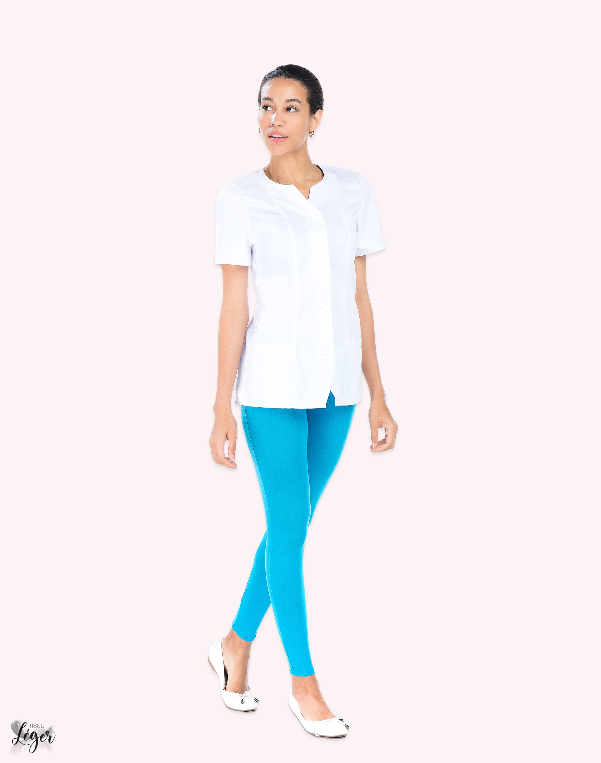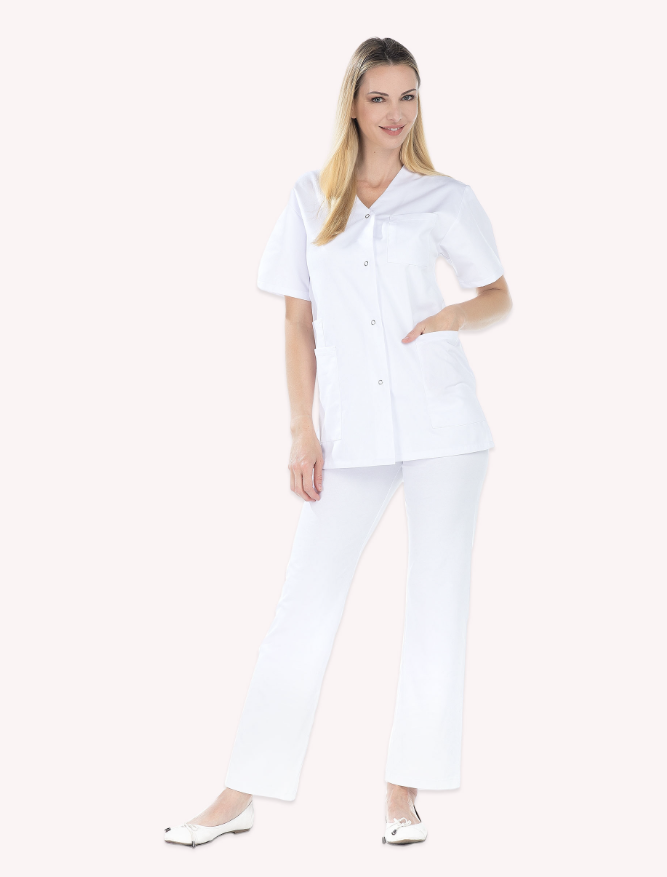 Tunique femme, manches courtes, fermeture par pressions, 2 poches basses, 1 poche stylo sur manche gauche, fentes dos, longueur 70 cm