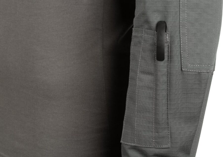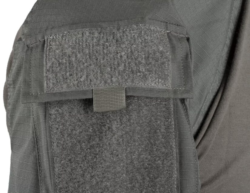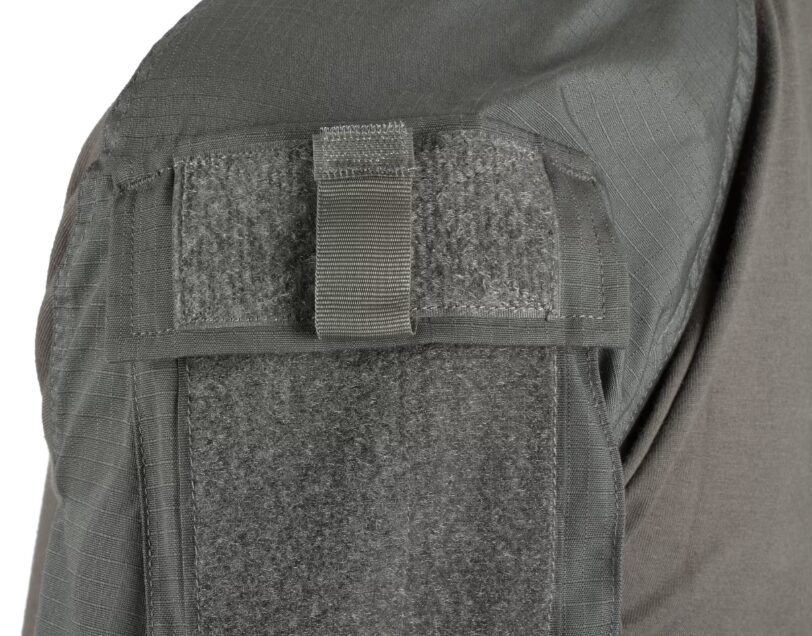 De grandes poches d’épaule permettent un rangement rapide et pratique et sur la couche extérieure se trouvent de grands panneaux à crochets et boucles pour l’identification de l’unité ou les patchs de moral. Les coudes sont renforcés par une couche supplémentaire de tissu qui sert également de compartiment pour les coudières. La largeur de l’extrémité des manches est entièrement réglable.