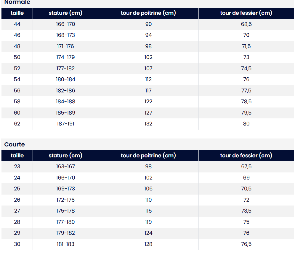 Tailles: 44–62, 94–110, 24–29