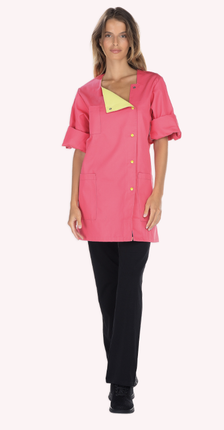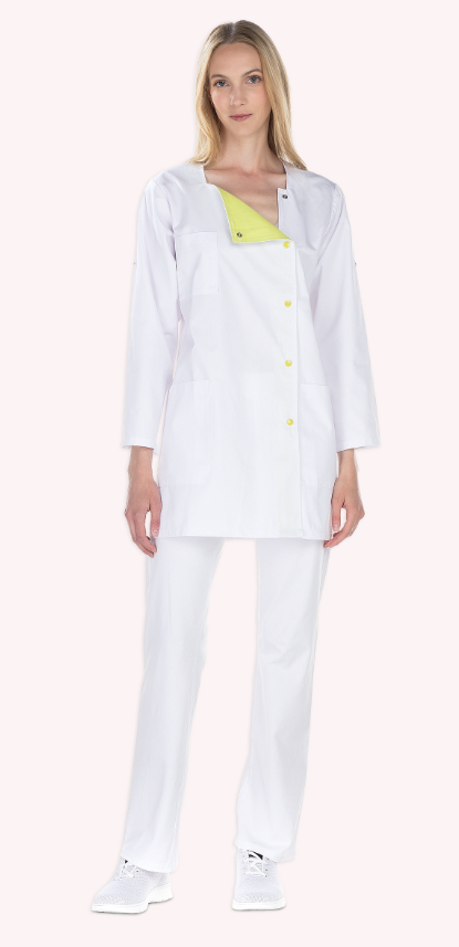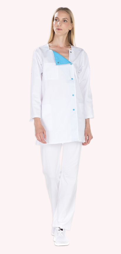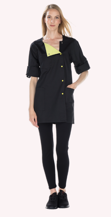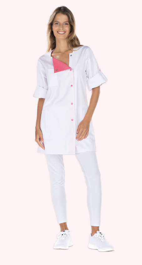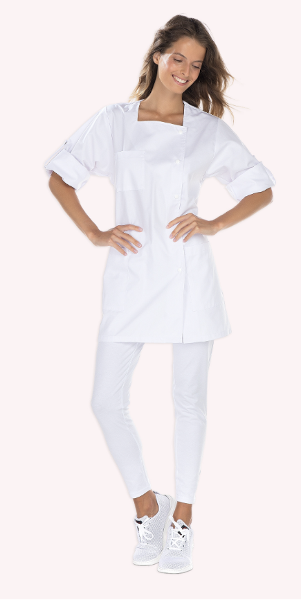 Tunique femme, manches longues tranformables, coupe ajustée, fermeture latérale par pressions, 2 poches basses, 1 poche poitrine, longueur 80 cm