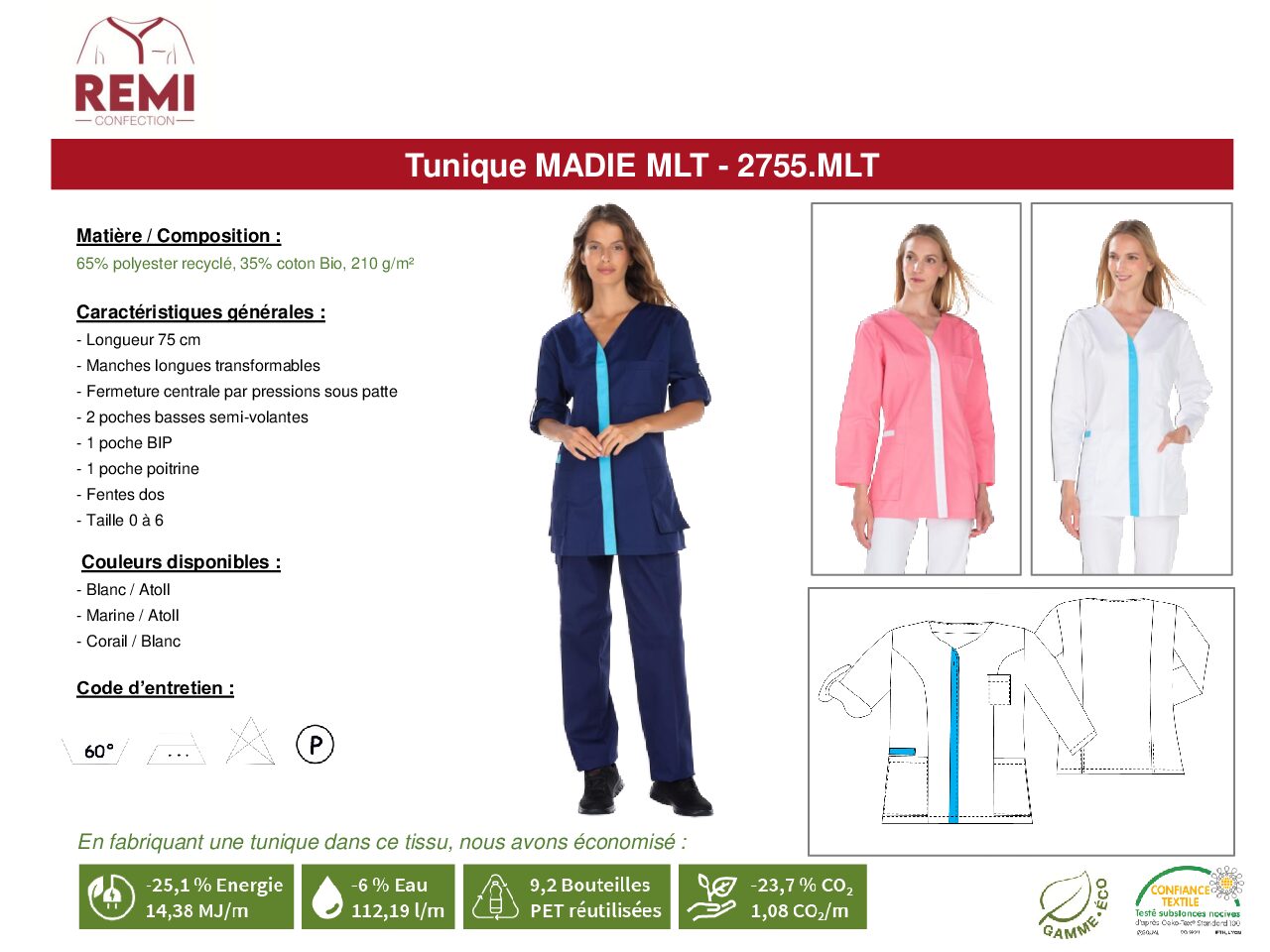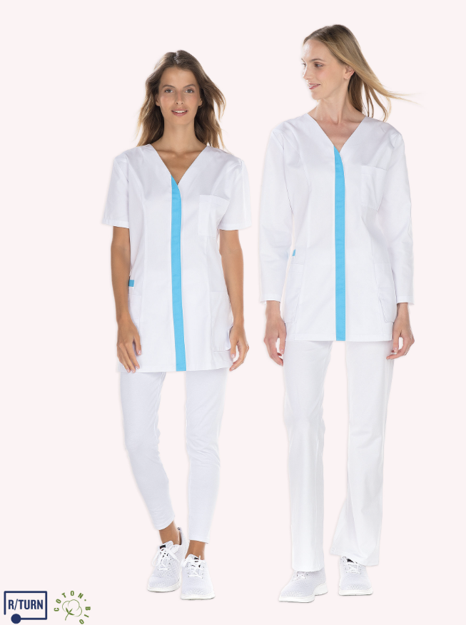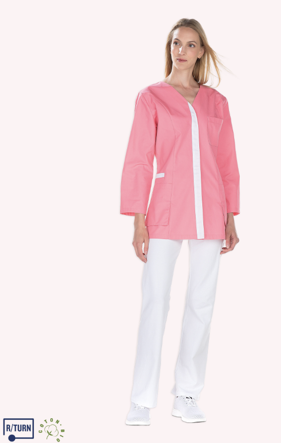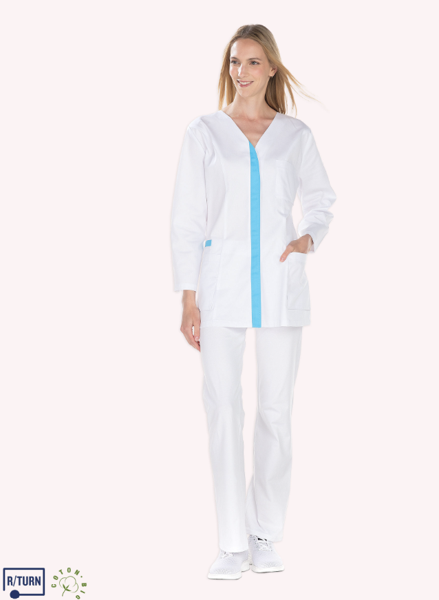 Tunique femme, manches longues transformables, fermeture par pressions sous patte, 2 poches basses non plaquées, 1 poche BIP, 1 poche poitrine, fentes dos, longueur 75 cm