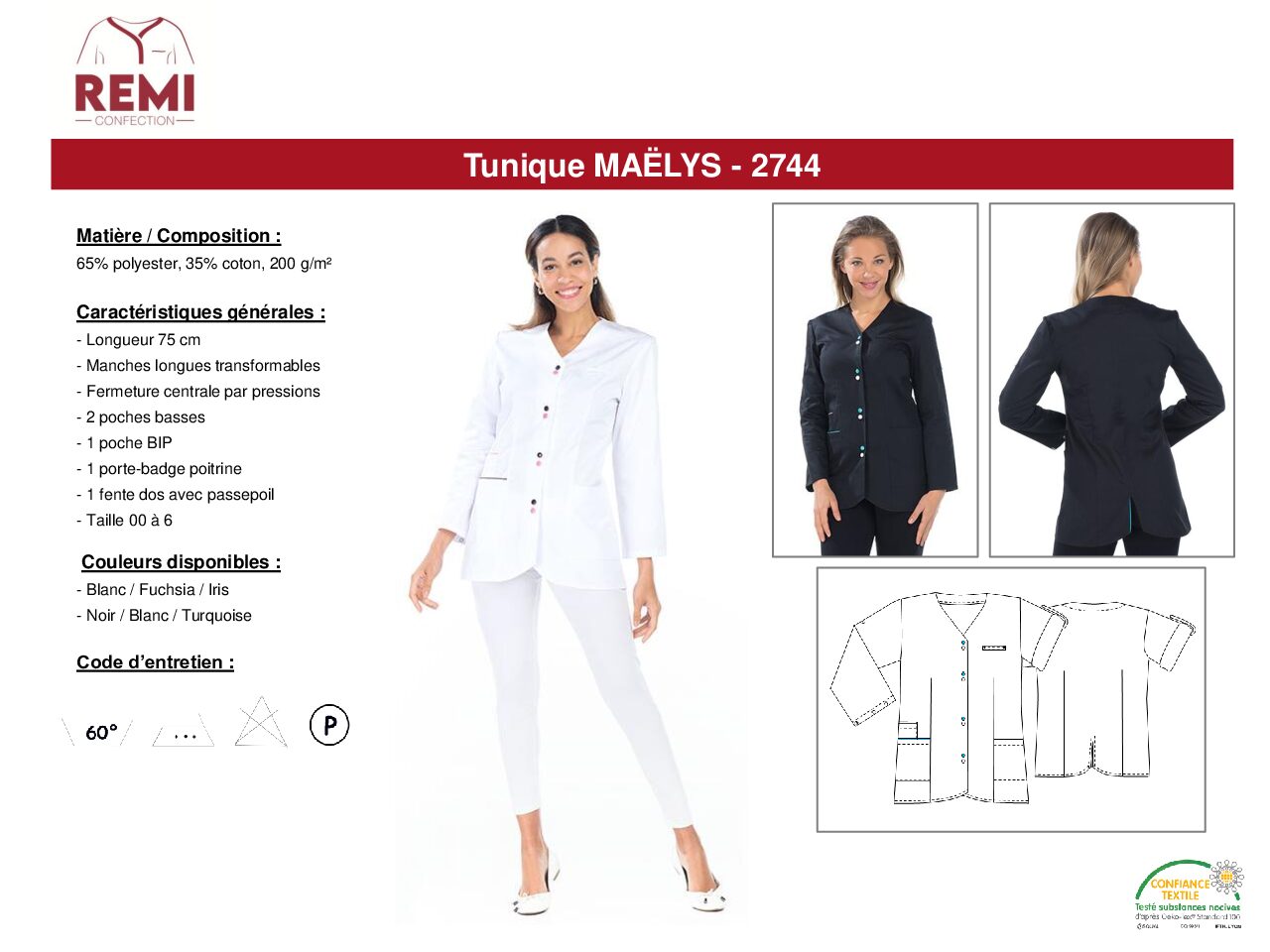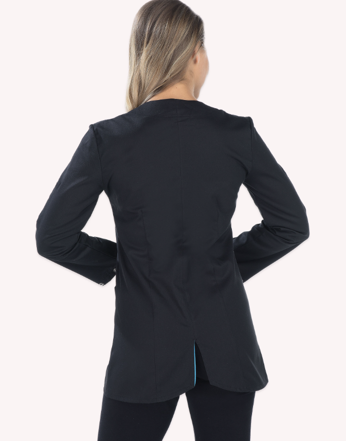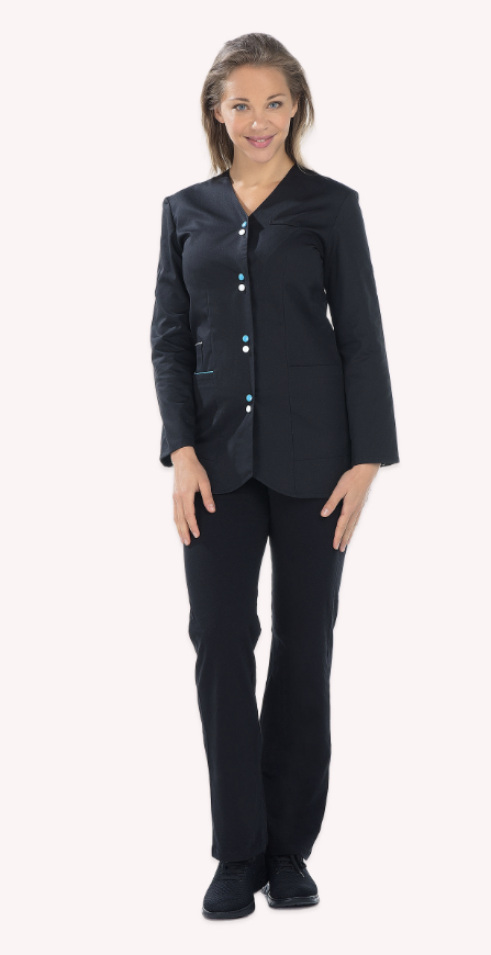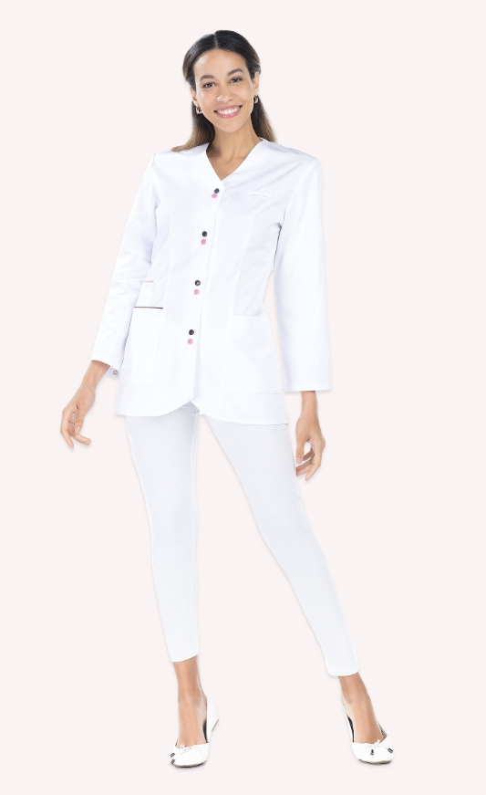 Tunique femme, manches longues transformables, coupe ample, fermeture par pressions, 2 poches basses, 1 poche BIP, 1 porte badge poitrine, 1 fente dos avec passepoil, longueur 75 cm
