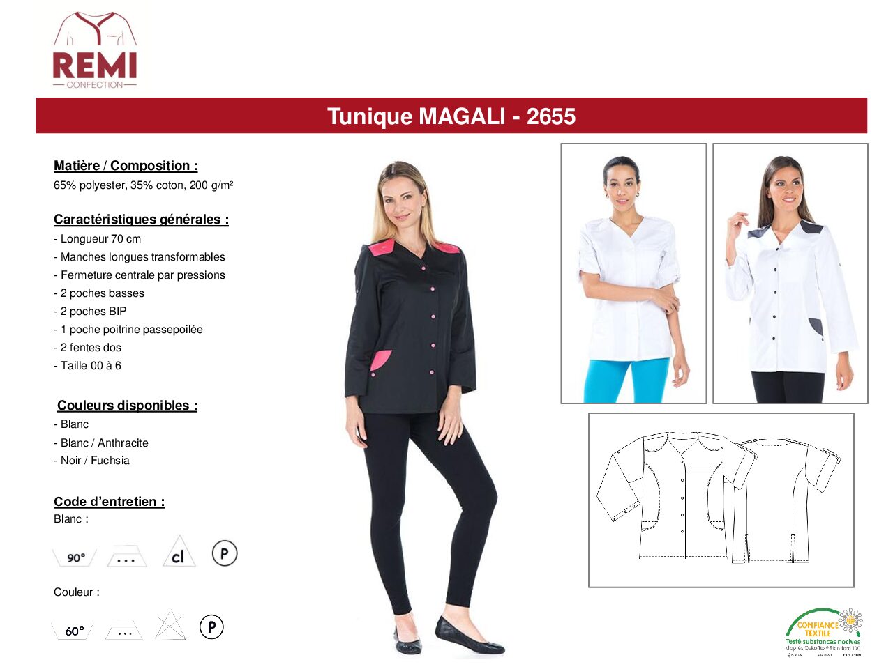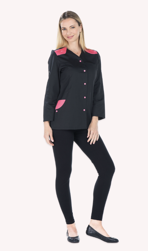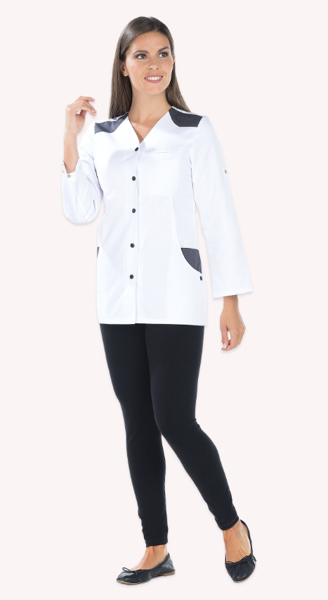Tunique femme, manches longues transformables, coupe ajustée, fermeture par pressions, 2 poches basses, 2 poches BIP, 1 poche poitrine passepoilée, 2 fentes dos, longueur 70 cm