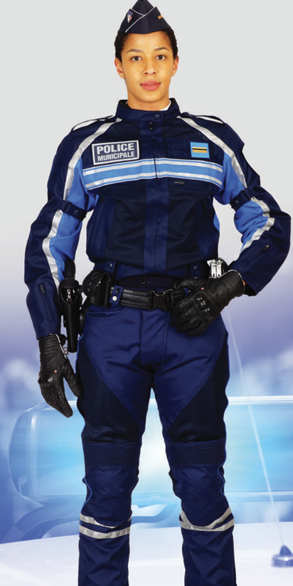 Fabriqué en tissu spécial temps chaud: polyester et mesh aéré, avec protection coudes, épaules et dorsales homologuées CE. Marquages et bandes Police Municipale rêglementaires.